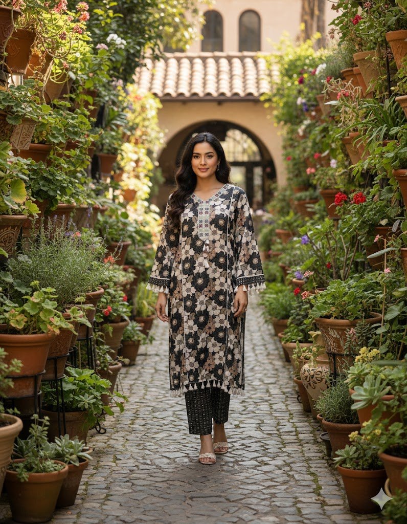 Turn heads with this stunning black and crème 2-piece set, designed to blend timeless charm with modern elegance. The outfit features delicate floral patterns that add a soft, feminine touch, while the crème thread tassels bring a playful yet sophisticated detail to the look. Crafted for comfort and style, this ensemble is perfect for festive gatherings, casual chic outings, or a graceful day-to-evening transition.