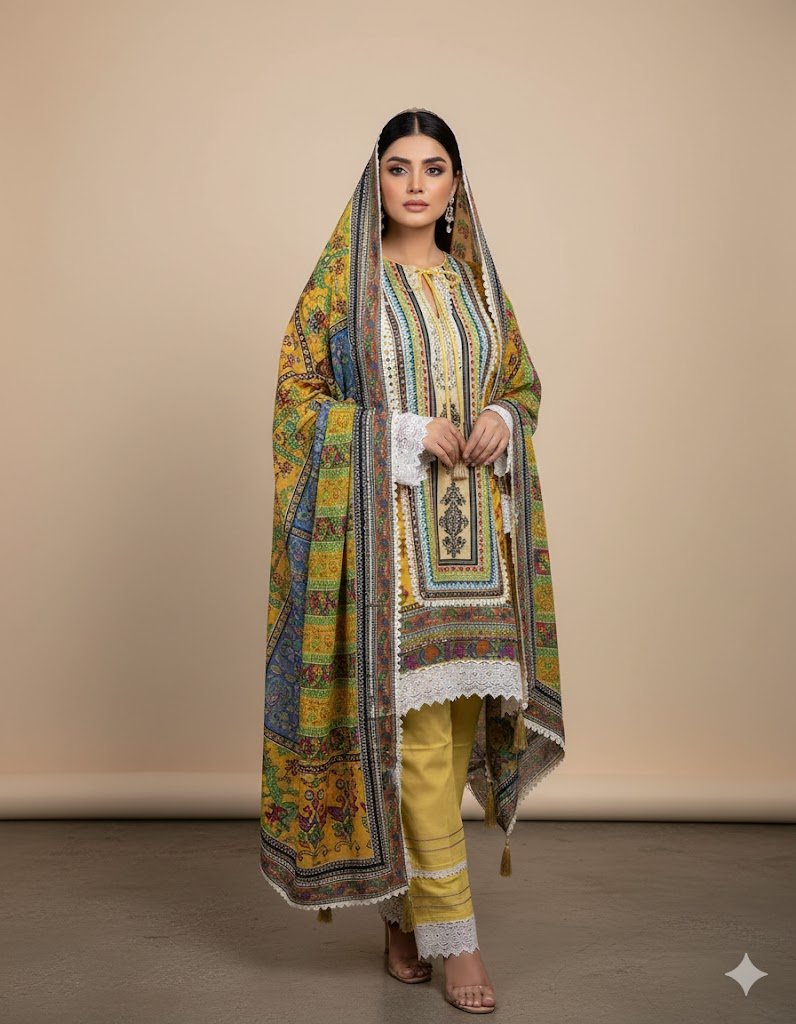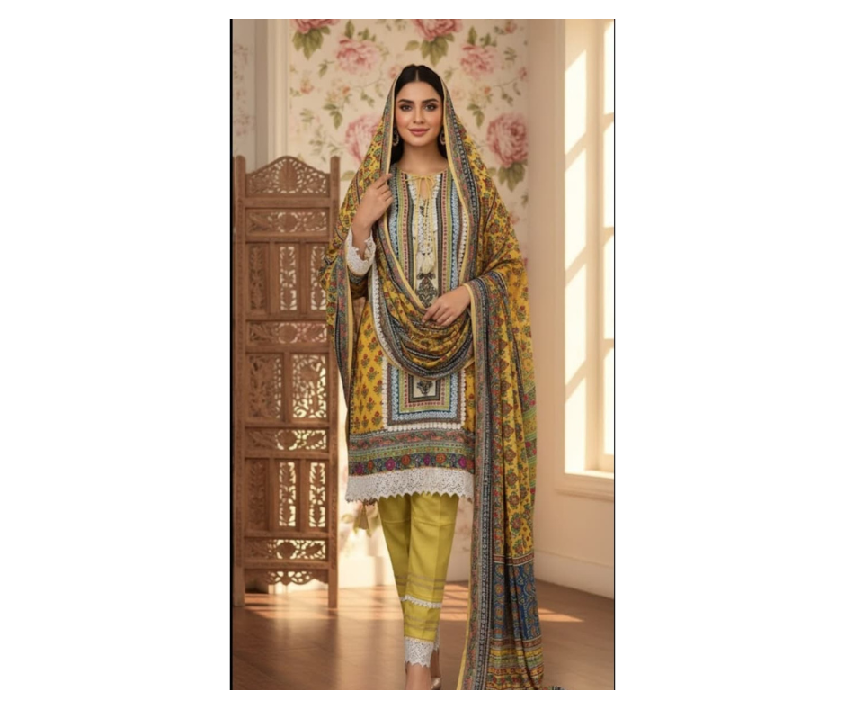 Designer Suit, crafted from soft and breathable pure lawn fabric for unmatched comfort and grace. Enhanced with intricate lace detailing, this ensemble exudes sophistication and style. Paired with a luxurious Fancy Dupatta, it ensures a flawless, effortless look.